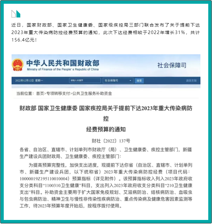 百億資金提前下發,再加上此前財政貼息貸款更新醫療設備政策的出臺,各地勢必會加快建立、儲備充足的醫療資源以應對突發情況,這就意味著儀器設備采購將在2023年迎來強勁需求!