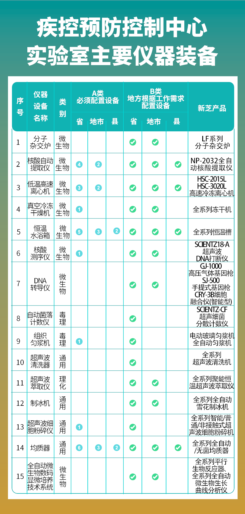 新芝生物作為全球知名的生物樣品制處理設備研制專家,始終堅持業界前沿的技術研究和應用開發,致力于為用戶提供優質的產品和貼心的服務,為全民健康保駕護航!實驗室建設和相關儀器配置供大家選擇。