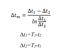 將總換熱量除以預(yù)期的升降溫時(shí)間即可獲得熱功率,若為換熱器內(nèi)的連續(xù)換熱過程,物料質(zhì)量應(yīng)為質(zhì)量流速,及kg/s,因此獲得的熱量q即為換熱功率。對(duì)于間壁式換熱,在計(jì)算換熱過程中需要考慮實(shí)際換熱過程的換熱面積以及傳熱系數(shù),因此可以以下公式計(jì)算相關(guān)參數(shù)。