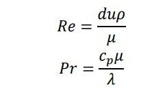 其中:λ:流體熱導(dǎo)率,W/(m·K);d:流體流通的管徑,m;u:流速,m/s;ρ:流體密度,kg/m3;μ:流體粘度,Pa·s;cp:流體定壓熱容,J/(kg·K)。