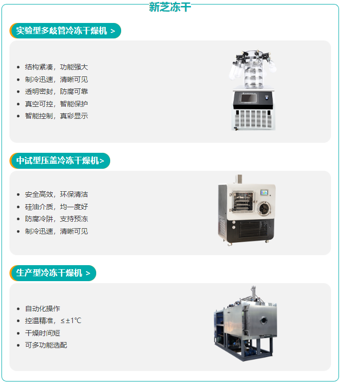 新芝生物深耕冷凍干燥技術研究多年,立足客戶需求,從凍干面積、樣品特性、溶劑組成等多個維度出發,推出具有高性價比、高效率、高適配性的一系列產品,體積從小到大、功能從簡到繁,總有一款可滿足您的需求,歡迎垂詢。