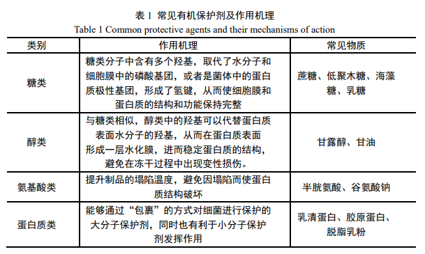 按凍干保護劑的化學結構可以分為有機保護劑和無機保護劑,由于有機保護劑所特有的結構與乳酸菌的有效抗冷凍密不可分,而無機保護劑僅表現為無機鹽(谷氨酸鈉、硫代硫酸鈉等),起到緩沖作用調節pH,故在乳酸菌發酵劑生產過程中廣泛應用有機保護劑提升凍干存活率。常見的高效有機保護劑有糖類、醇類、氨基酸類、蛋白質類等。