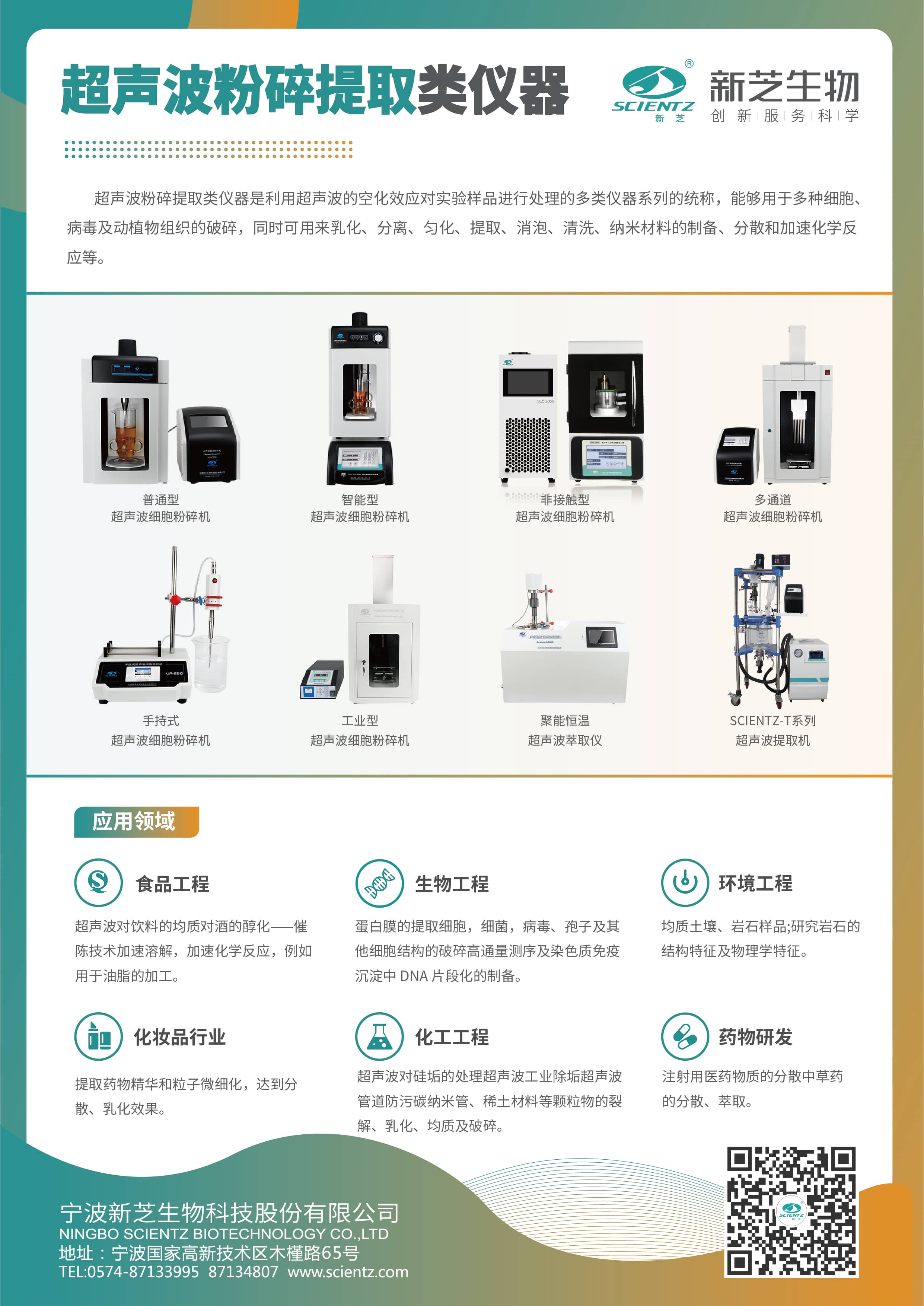 企業公眾號新芝生物專業研發生產超聲波細胞粉碎機、超聲波清洗機和超聲波細胞破碎儀等各種科研實驗儀器與工業化生產設備