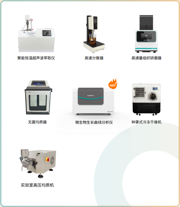 新芝生物可為食品科學(xué)領(lǐng)域提供相關(guān)解決方案,應(yīng)用范圍涵蓋了從食品樣品前處理中進(jìn)行細(xì)胞破碎、萃取、分散,到食品檢測(cè)中對(duì)食品的各種成分分析,如營(yíng)養(yǎng)成分、添加劑、農(nóng)藥殘留、重金屬等成分,再到食品安全監(jiān)控環(huán)節(jié)中可監(jiān)控和預(yù)警,如微生物污染檢測(cè)、致病菌檢測(cè)等,還涵蓋了食品工藝研發(fā)過(guò)程中會(huì)遇到的發(fā)酵、配方優(yōu)化等環(huán)節(jié),皆可閉眼入手新芝生物強(qiáng)烈推薦的解決方案!