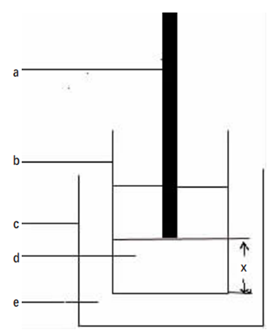 a:鈦探針(直徑1.50cm);b:燒杯(直徑3cm,高7.5cm);c:大燒杯(直徑7cm,高90cm);d:脂質體混懸液;e:冰水浴;x:探針與燒杯底部距離
