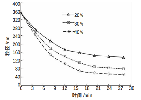 如圖3所示,超聲功率分別為20%、25%、30%、35%、40%,增加超聲時間,磷脂含量為10mmol/L的脂質體粒徑變化,結果顯示,隨著超聲時間的增加,脂質體粒徑減小,直到20min時得到一個穩定的脂質體粒徑,不再發生變化。為了證實超聲時間足夠形成穩定的脂質體粒徑,增加超聲時間到25min,考察脂質體的粒徑分布。