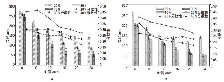 A:磷脂含量為10mmol/L,超聲功率分別為20%、30%和40%時粒徑及分散性隨超聲時間的變化(探頭深度10mm);B:磷脂含量為10mmol/L,超聲功率分別為20%、30%和40%時粒徑及分散性隨超聲時間的變化(探頭深度15mm)