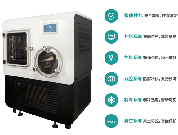 | ? 進口真空泵 | ? 自動充氮接口 | ? T型掛瓶架 | ? 共晶點測試 | ? 手機APP遠程控制 |