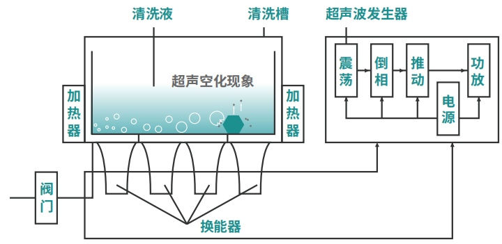 通過換能器,將功率超聲頻源的聲能轉換成機械振動,通過清洗槽壁將超聲波輻射到槽子中的清洗液。由于受到超聲波的輻射,槽內液體中的微氣泡能夠在聲波的作用下快速變大破裂,破裂時產生的高強度剪切力作用于各類樣品上,從而達到清洗、提取、乳化、加速溶解、粉碎、分散等作用。