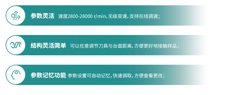 ? 參數靈活 速度2800-28000 rpm,無級變速,支持在線調速 | ? 結構靈活簡單 可以任意調節刀具與臺面距離,方便更好地接觸樣品 |