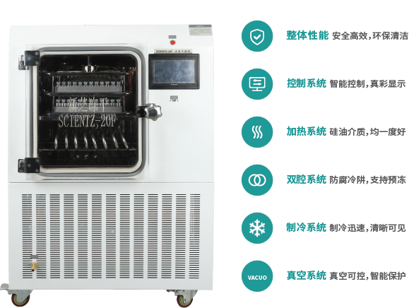SCIENTZ-20F硅油原位凍干機是專門用來處理中小批量對升溫曲線要求復雜的樣品(特別是藥品、微生物制品、名貴藥材等)的冷凍干燥機,具有控溫精度高、溫度均一性好、樣品干燥時間短等特點。